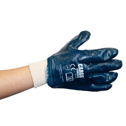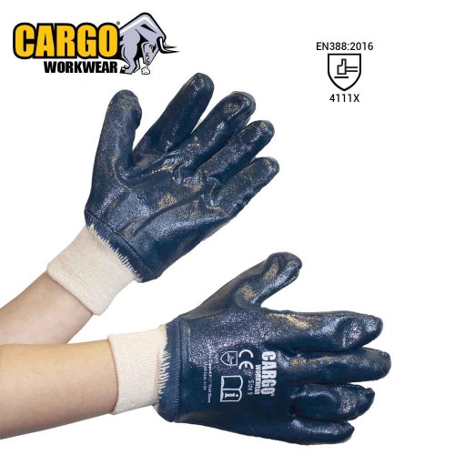 Description: The Cargo Nitrile Dipped Knit Wrist Glove has a cotton supported liner with a knitted wrist. This glove is fully coated in Nitrile to offer a waterproof barrier to the glove. This good offers enhanced physical resistance but also has good dexterity for ease of use.